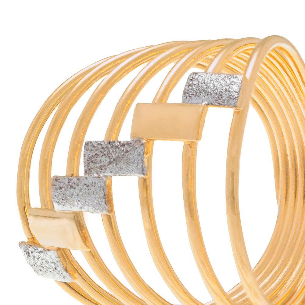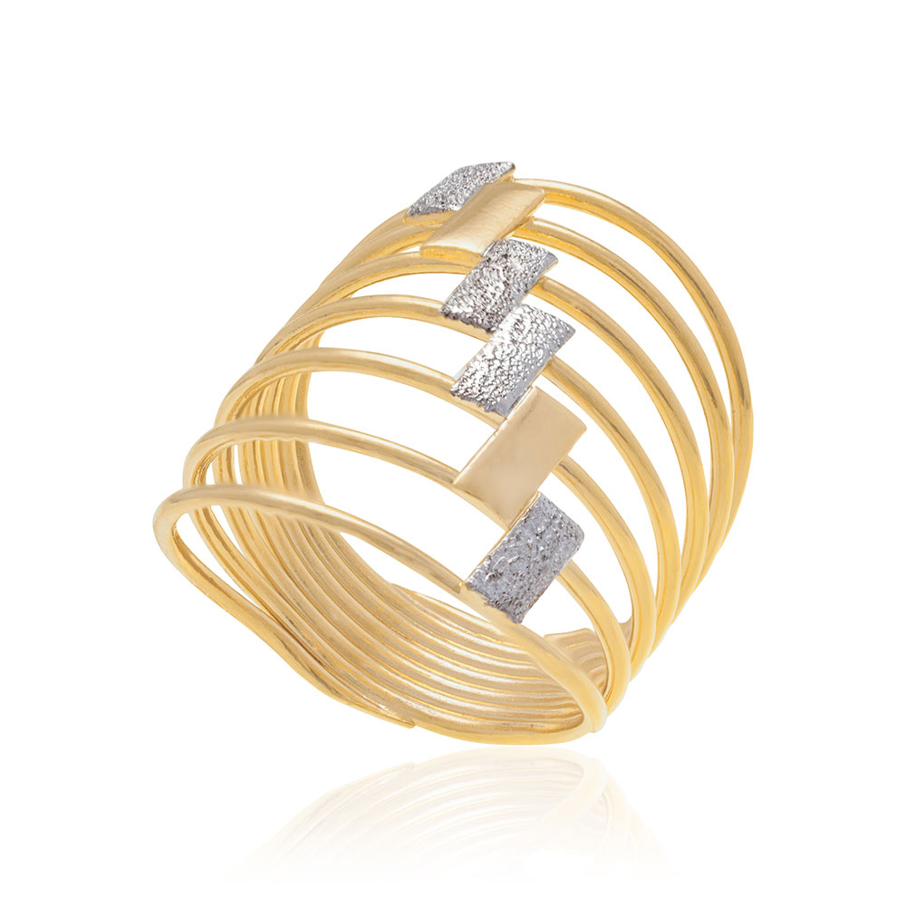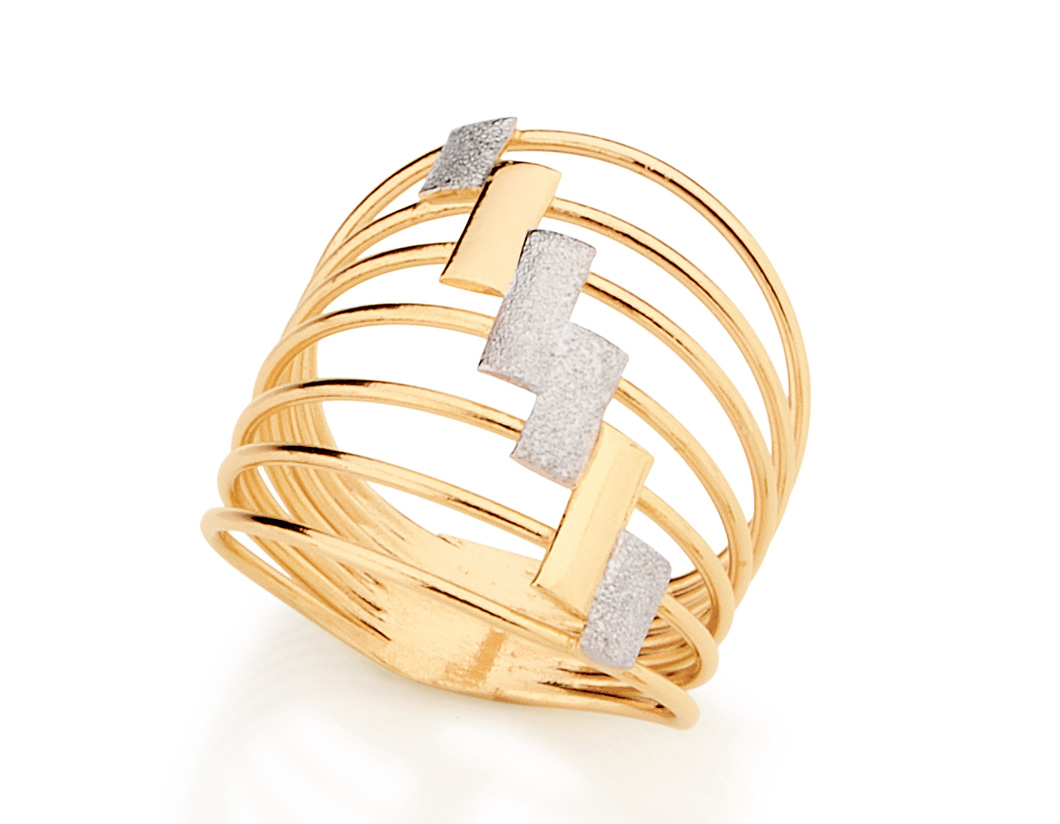 Anel rommanel folheado a ouro 18k. anel formado por sete fios com detalhes retângulares granitados com aplicação de rhodium intercalados por retângulos lisos.