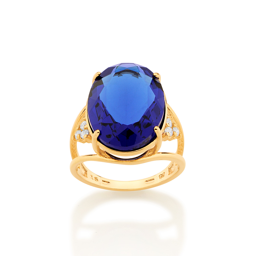 Maxi anel com laterais vazadas e cravejadas 6 zircônias de 1,75 mm, com 1 cristal oval de 13x18 mm ao centro.
