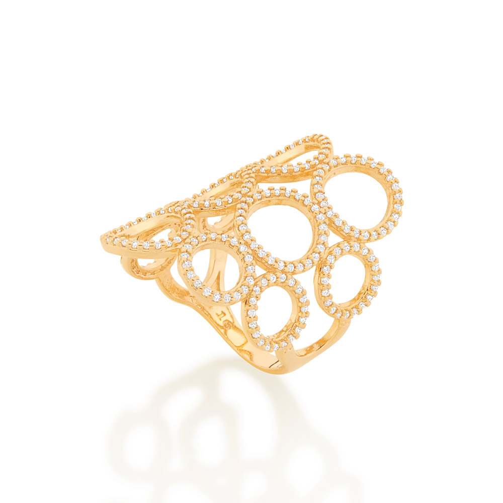 Maxi anel formado por círculos vazados, cravejado por 220 zircônias de 0,80 mm.