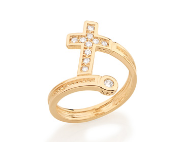 Anel em espiral liso com filetes trabalhados nas laterais tendo em uma ponta cruz cravejada por 10 zircônias de 1,25mm unida a outra ponta com 1 zircônia de 2mm (11 total).