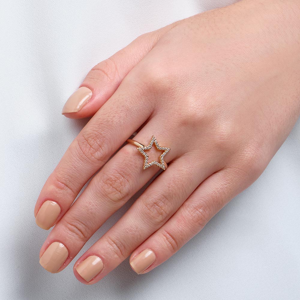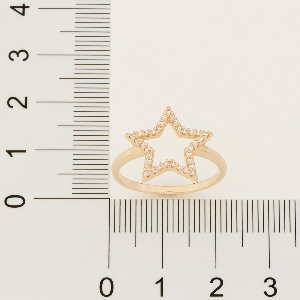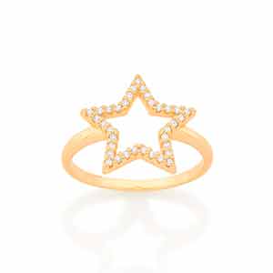Anel formado por estrela vazada, cravejada por 35 zircônias de 1,0 mm.