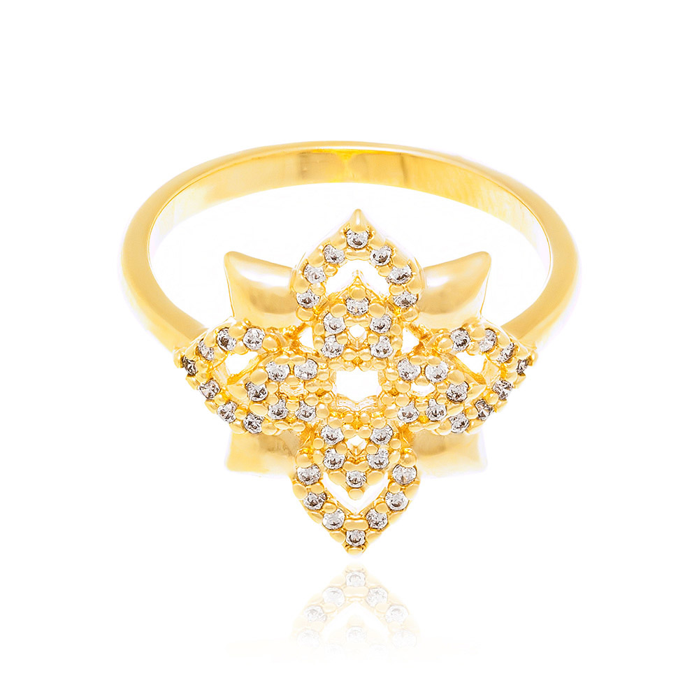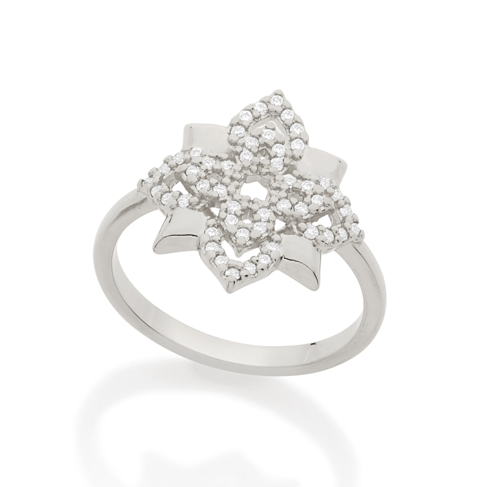 Anel rommanel flor, cravejado por 48 zircônias de 1,0 mm.