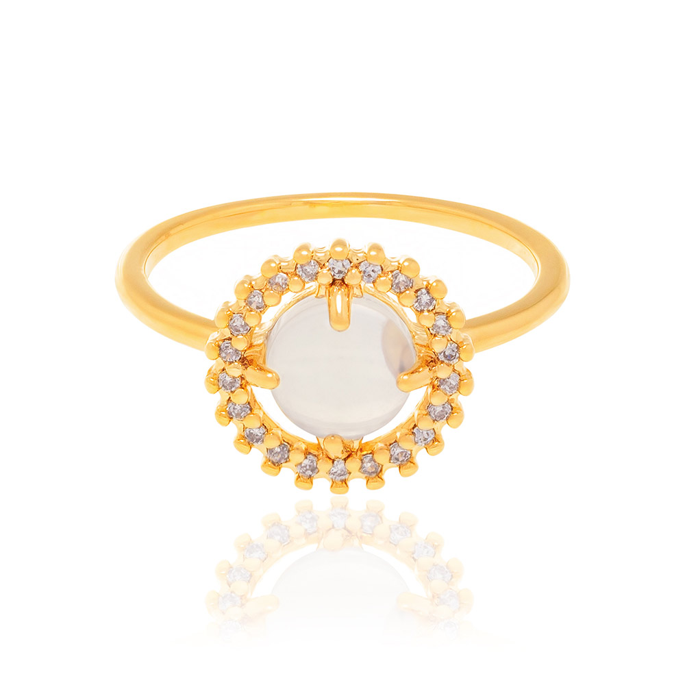 Anel com parte superior redonda, composta por 22 zircônias de 1,00 mm. tendo ao centro 1 cristal pedra da lua de 6,5 mm.