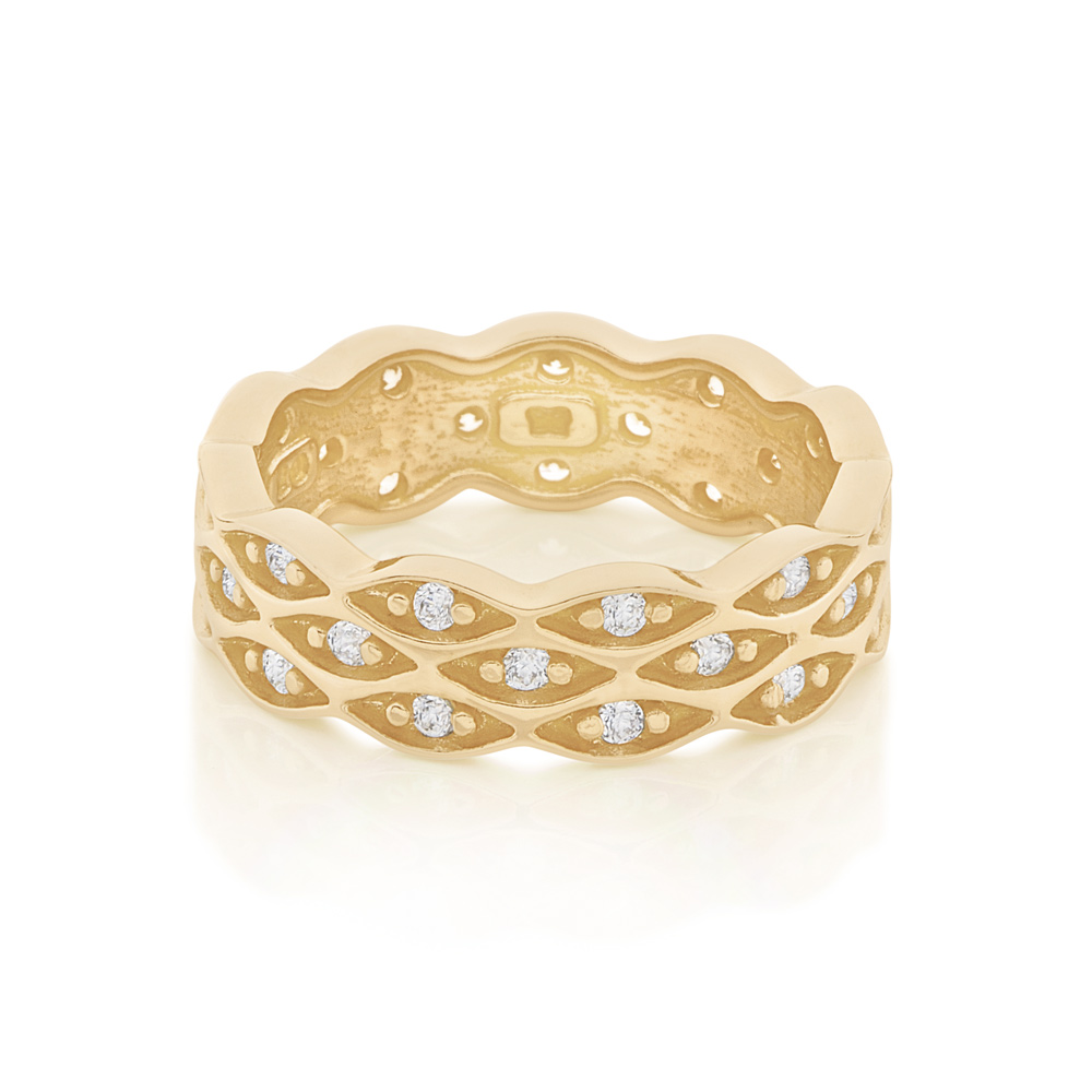 Anel formado por aro trabalhado no formato de navetes, composto por 30 zircônias de 1,50 mm. (a quantidade de zircônias pode mudar dependendo do tamanho.