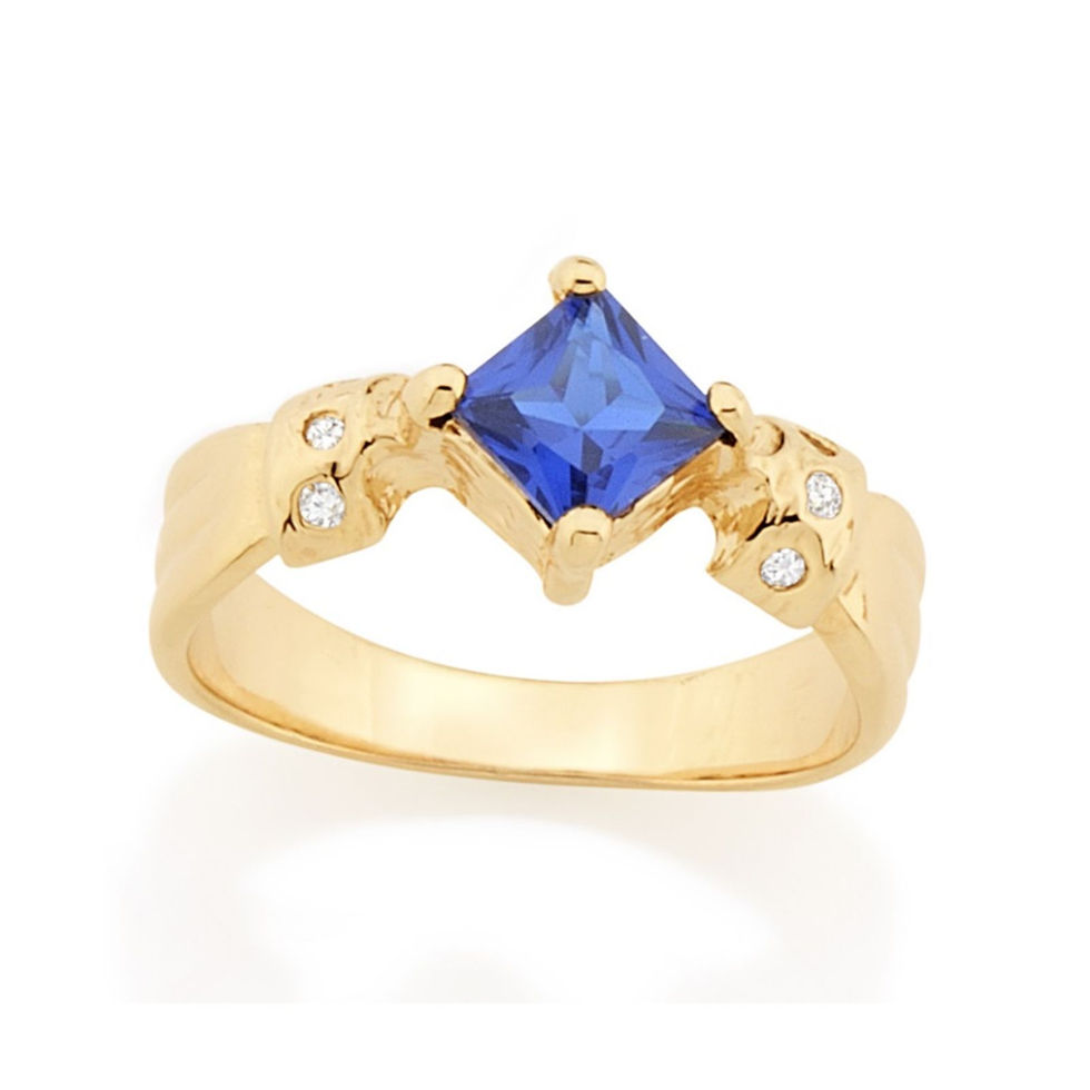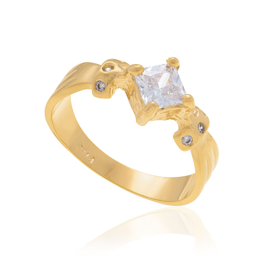 Anel de formtura rommanel folheado a ouro 18k. anel rommanel contendo detalhes de filetes nas laterais e zircônia quadrada de 5x5 mm no centro, envolta por outras 6 zircônias de 1,25 mm; escolhe entre diversas opções de cores para personalizar esta joia do jeitinho que você gosta.