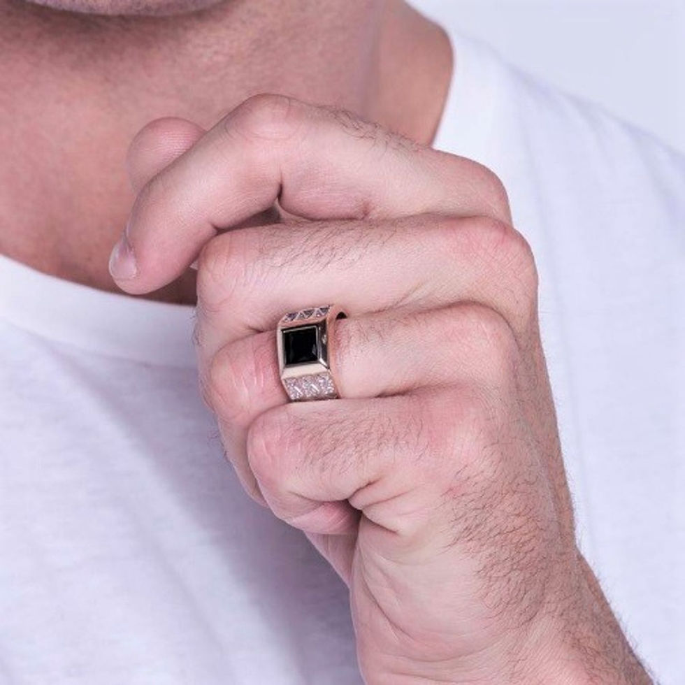 Anel rommanel masculino formatura folheado a ouro 18k. anel composto por 1 cristal quadrado de 8 x 8 mm, tendo as laterais trabalhadas com aplicação de rhoium. Disponível nas cores preto e vermelho. Coleção rommanel by mario queiroz.