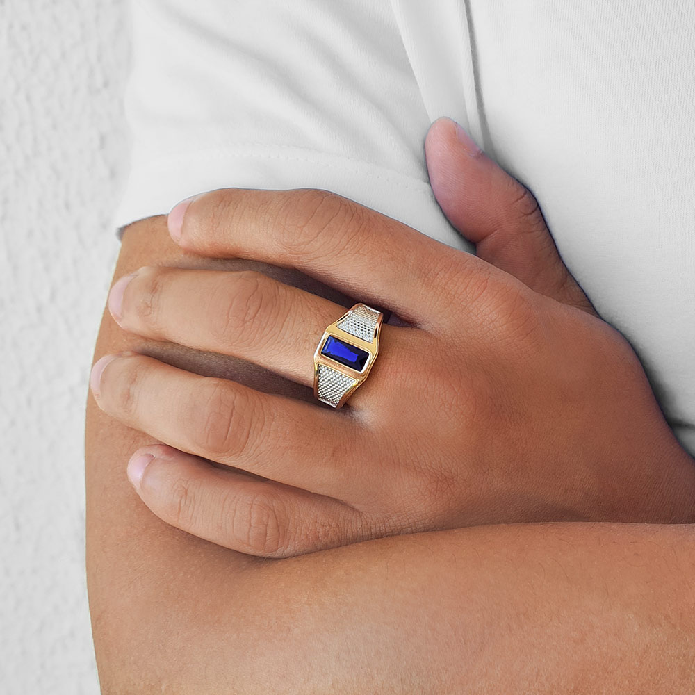 Anel masculino composto por cristal retangular de 5x10 mm, formado por laterais trabalhadas, com aplicação de rhodium.