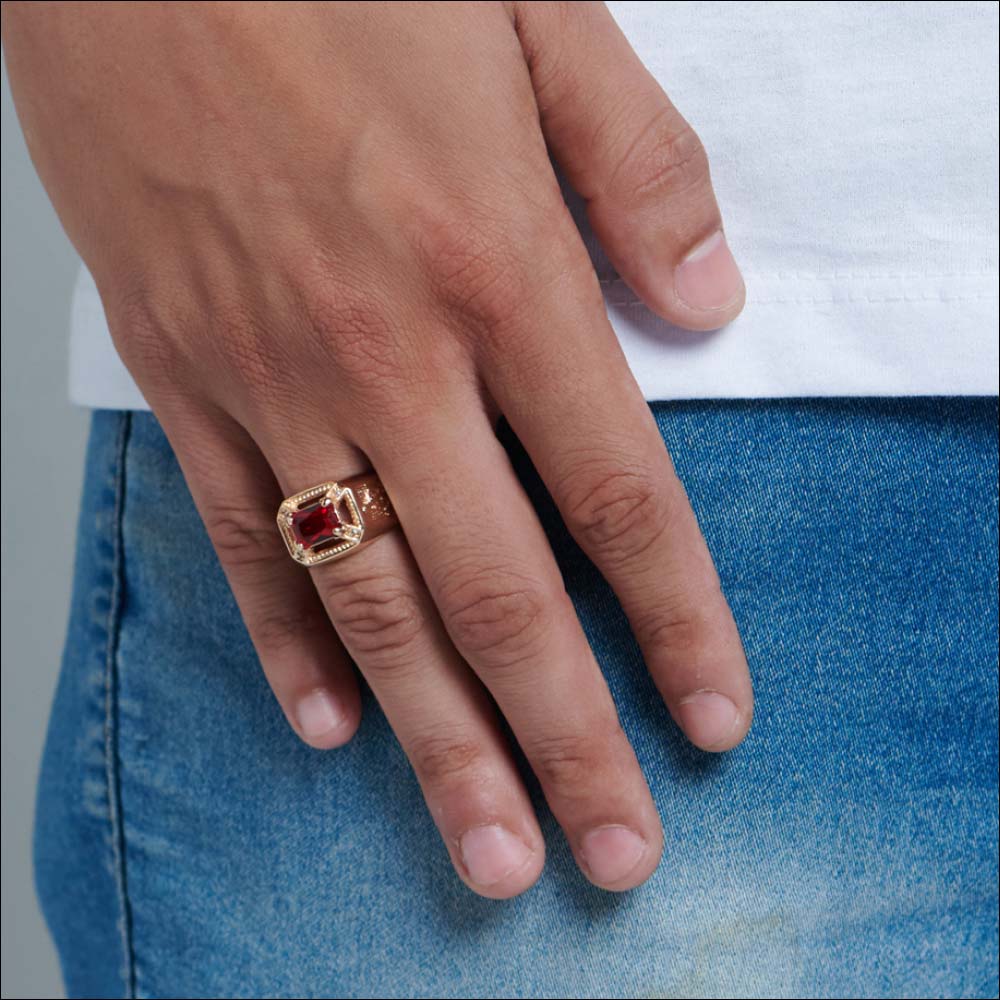Anel rommanel masculino formatura folheado a ouro 18k. anel formado por detalhes trabalhados nas laterais, com o símbolo grego "alfa e ômega", com 1 cristal retangular de 6 x 8 mm e 4 zircônias de 1,25 mm na parte superior. Disponível nas cores azul, preto e vermelho.