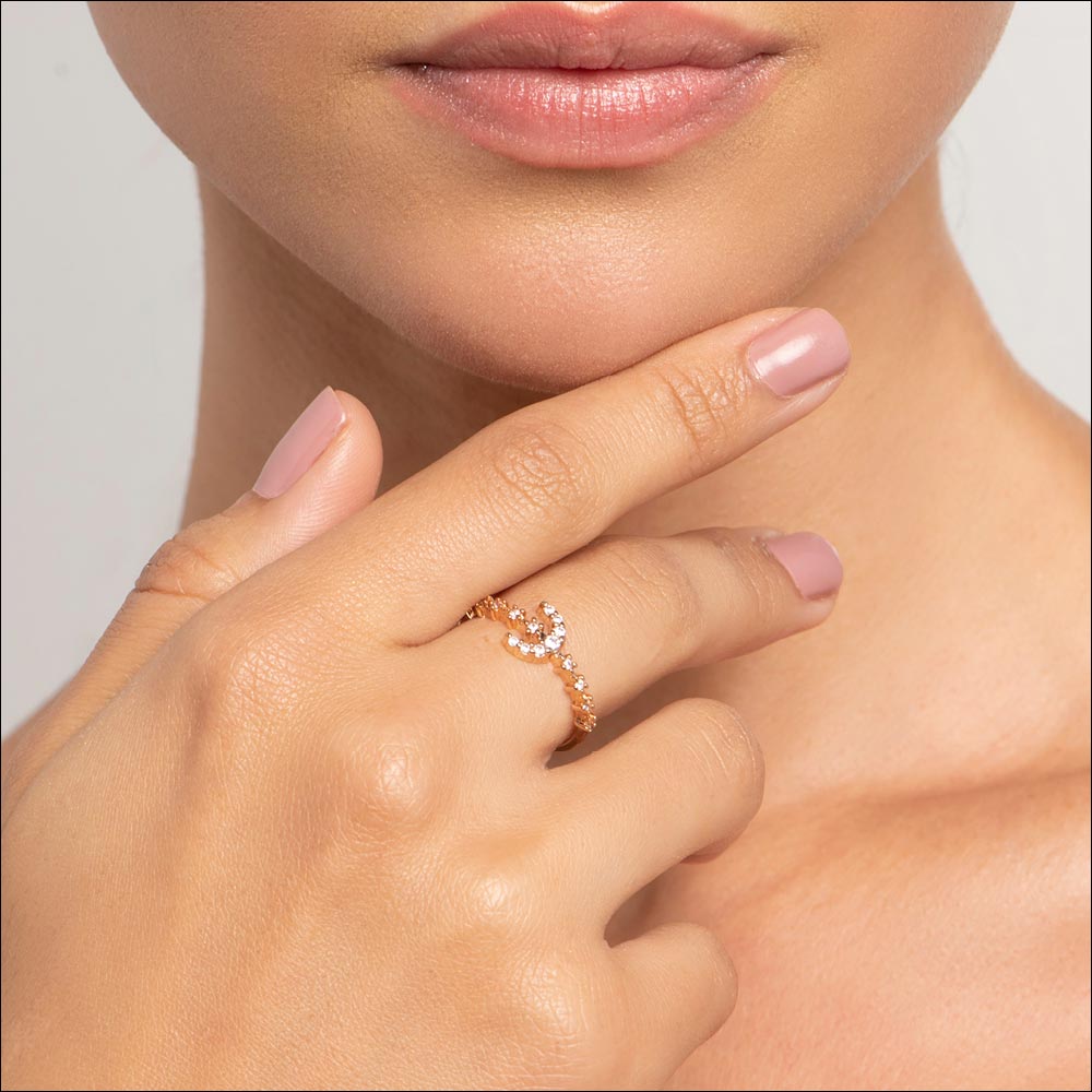 Anel rommanel folheado a ouro 18k, anel com aro composto por 9 zircônias de 1,25 mm, com meia lua ao centro , crajveada por 4 zircônias de 1,25 mm , 2 zircônias de 1,5 mm e 1 zircônia de 2 mm.
