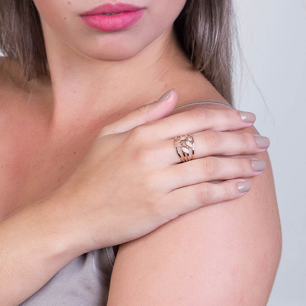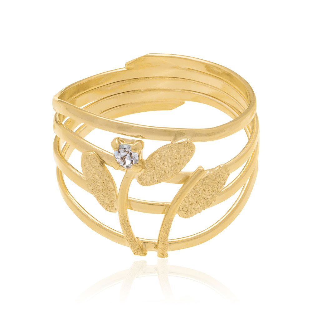 Anel rommanel 510092 Banhado a ouro 18k, formado por quatro fios, tendo uma flor no centro, com um cristal e folhas granitadas.