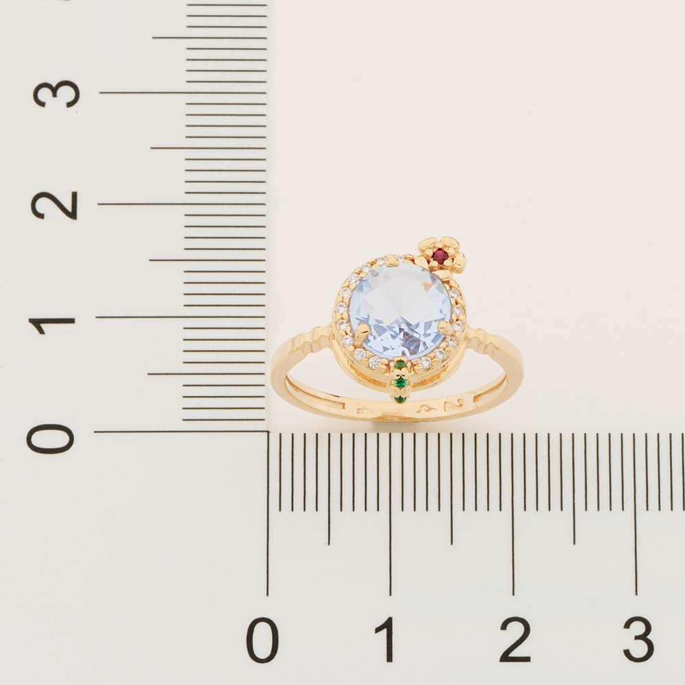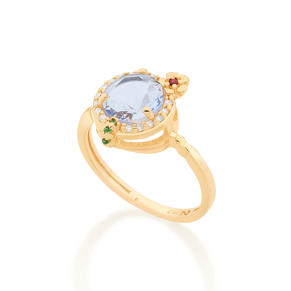 Anel rommanel banhado a ouro 18k, modelo "drink" formado por cristal azul e zircônias brancas, vermelhas e verdes. Joia pertencente a coleção ana hickmann.