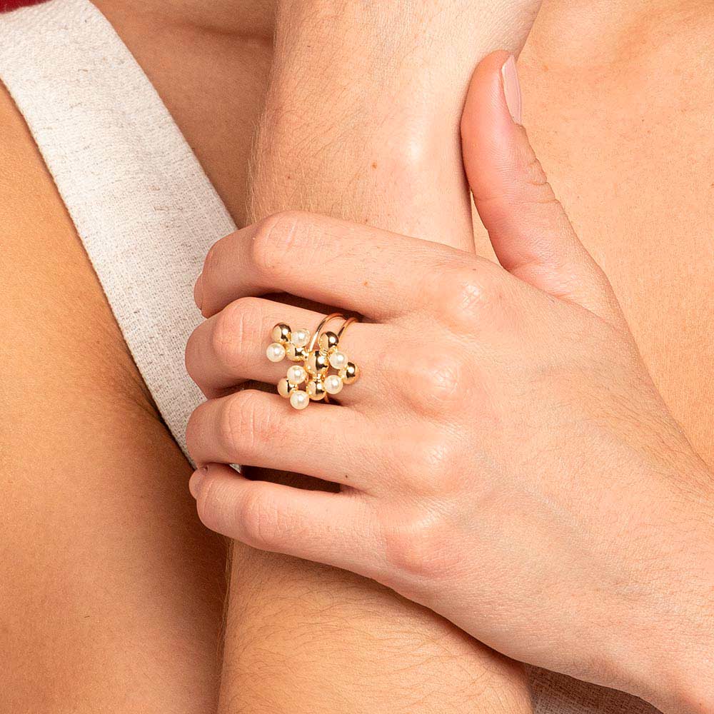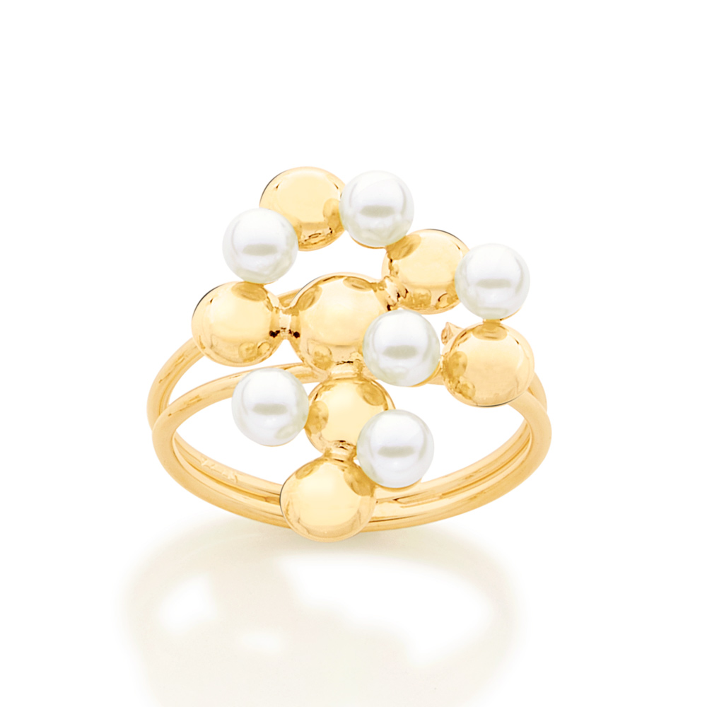 Anel rommanel 512318 Banhado a ouro 18k, anel de aro duplo, composto por 6 pérolas sintéticas de 4 mm, 6 meias esferas de 5 mm e 1 esfera de 6 mm. jóia licenciada coleção ana hickmann.