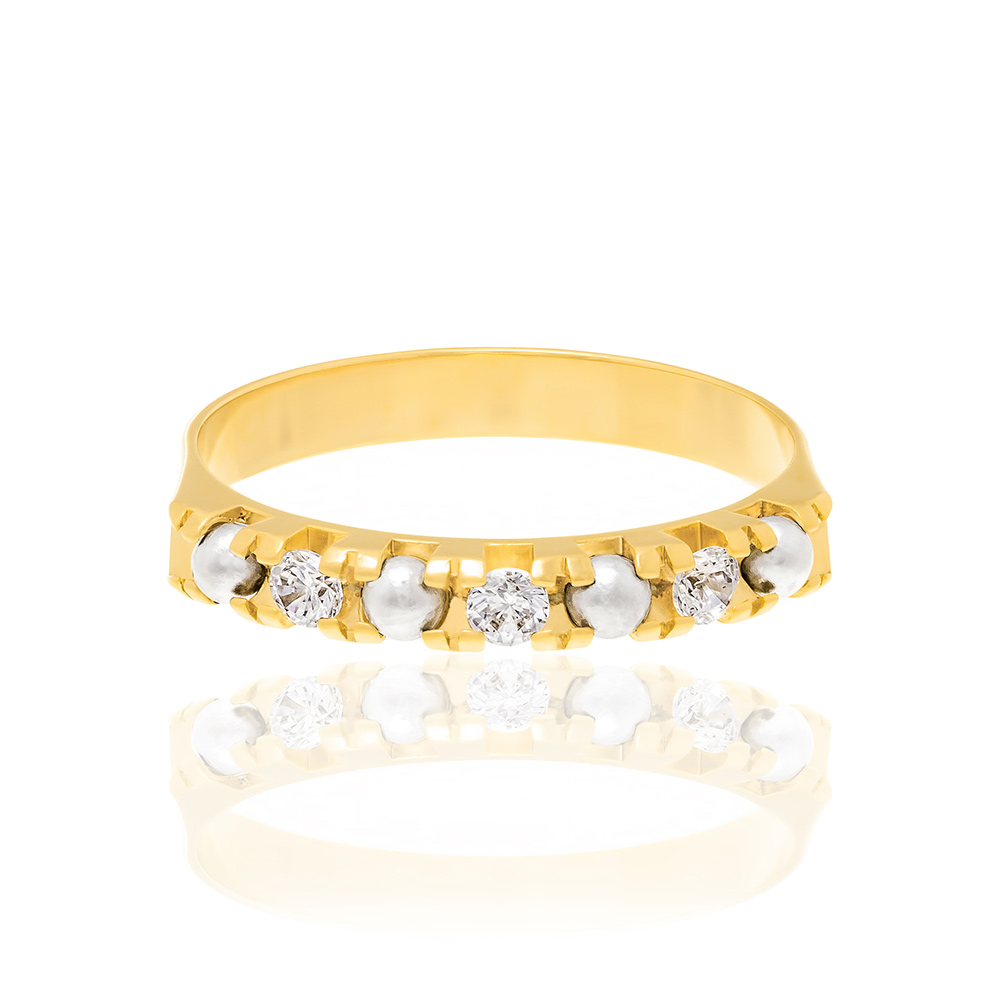 Meia aliança cravejada por 3 zircônias de 2,5 mm intercaladas por 4 pérolas de 2,5 mm.
