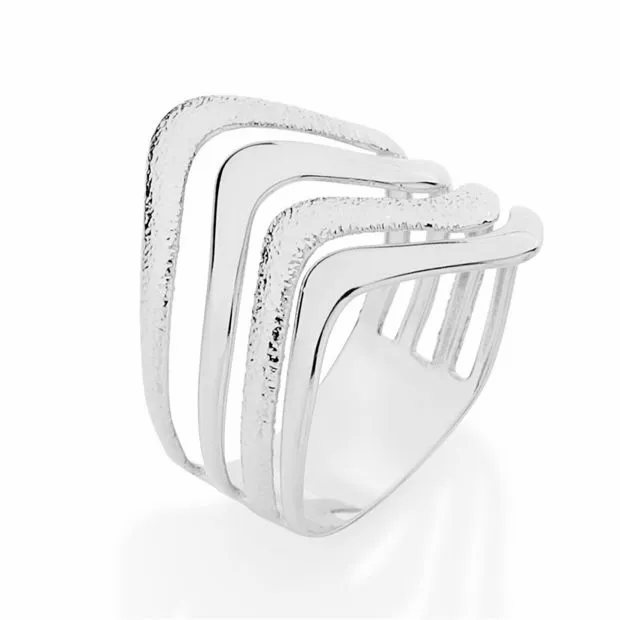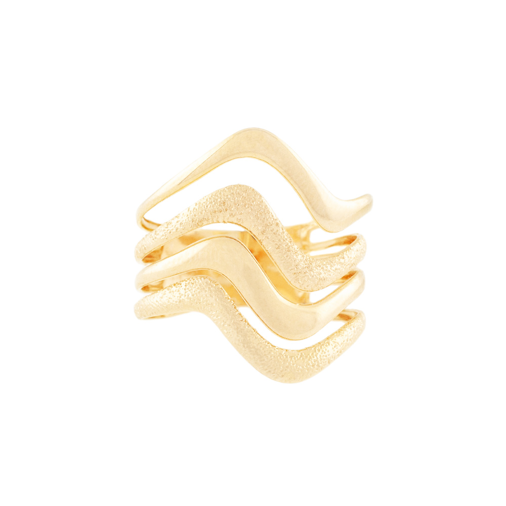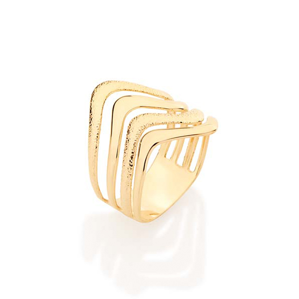 Anel rommanel folheado a ouro 18k, anel formado por frisos ondulados, trabalhados e granitados vazados. Disponível nas opções de folheado a ouro e folheado a rhodium (ouro branco).
