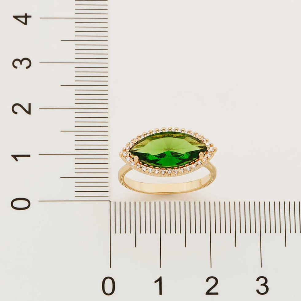 Anel rommanel 521888 Banhado a ouro 18k, formado por cristal verde (tom esmeralda) em formato de navete, sendo cravejado por 32 zircônias (pedras) brancas. Cristal verde possui 7x15 mm, e as zircônias brancas possuem 1 mm cada.