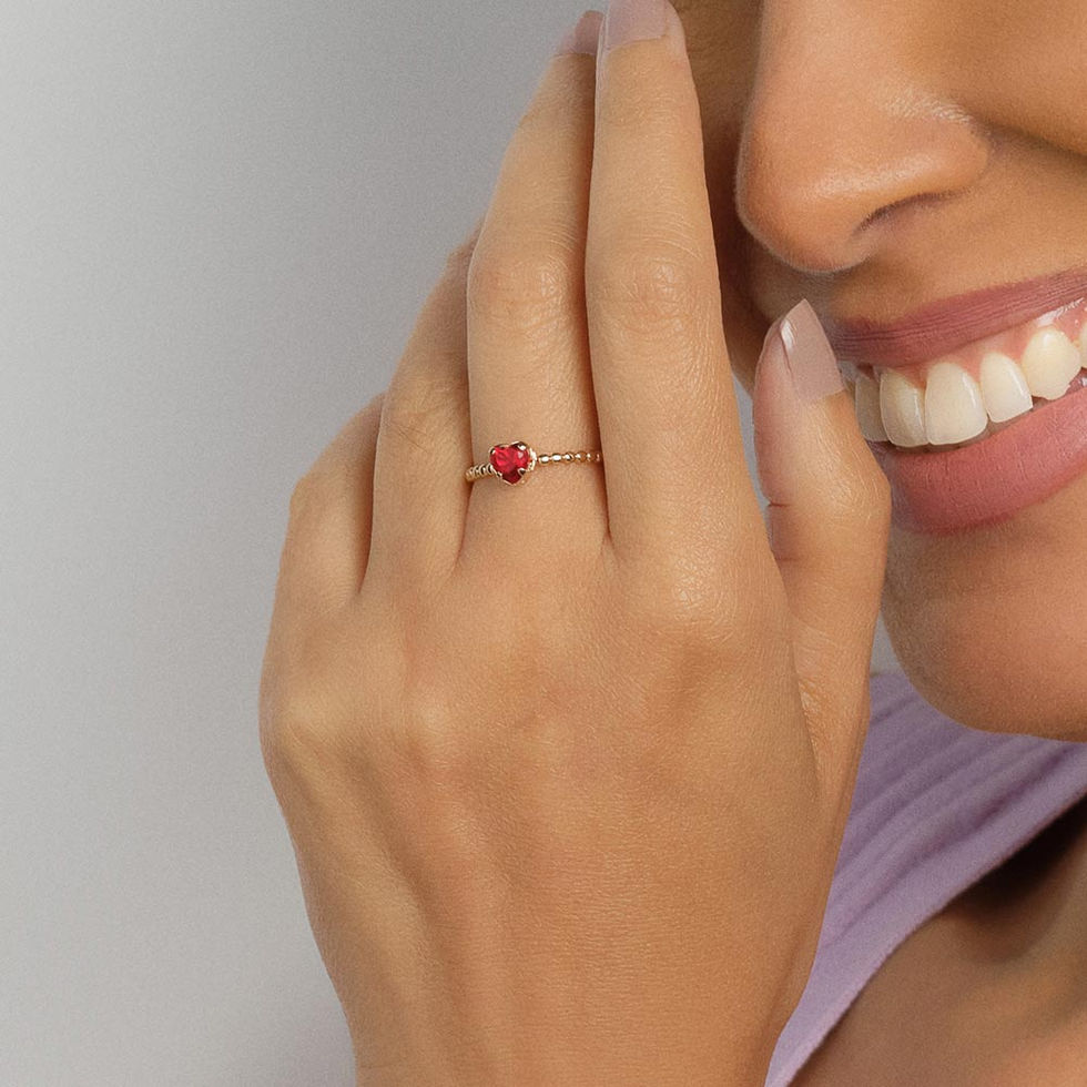 Anel solitário com aro trabalhado por esferas, composto por 1 cristal formato coração de 5x5 mm.