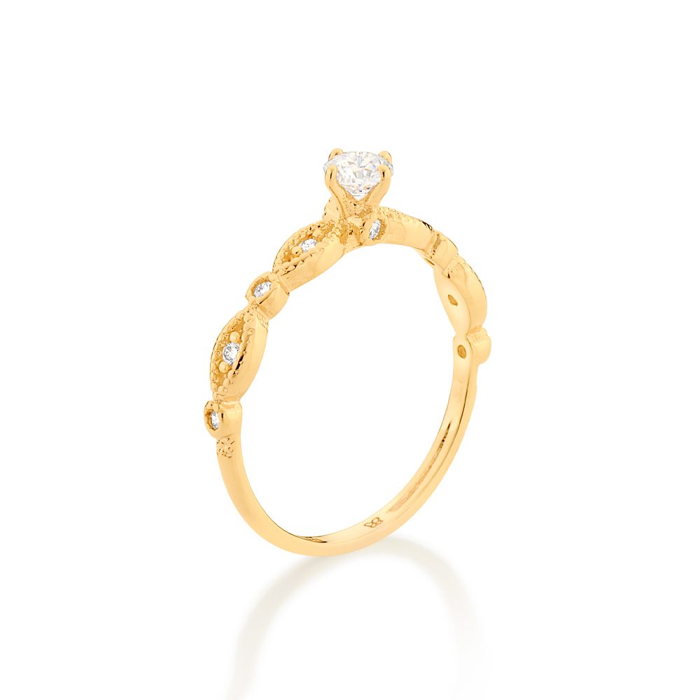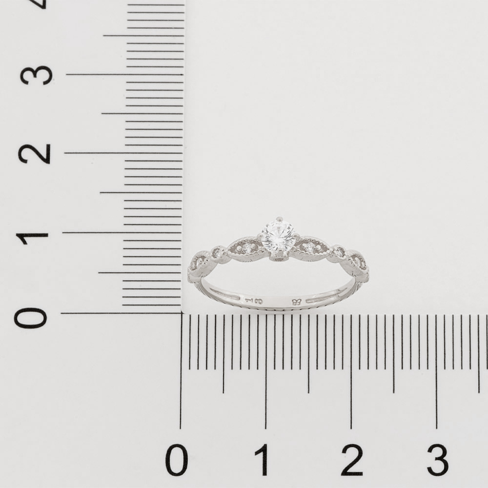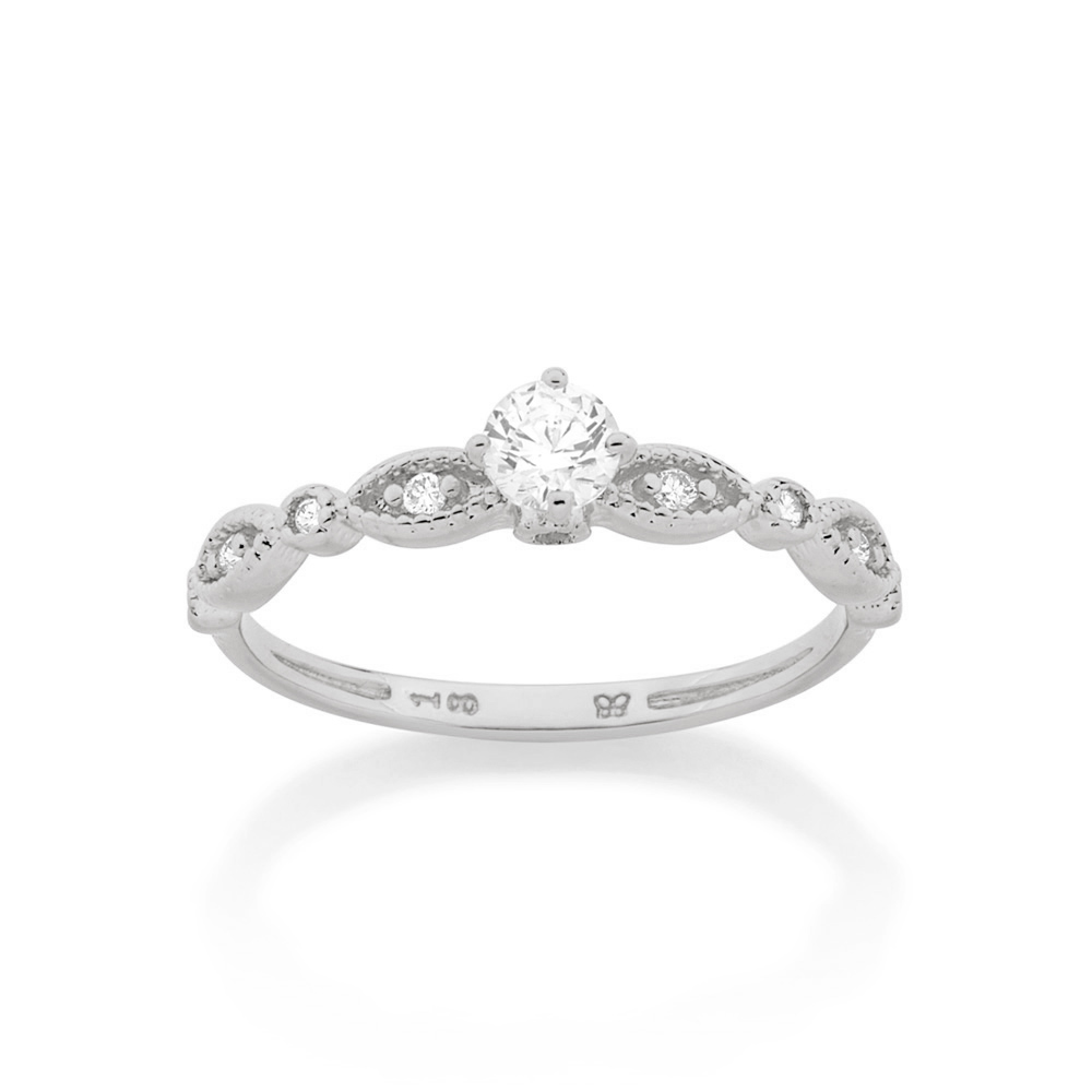 Anel solitário formado por aro com detalhes no formato de navetes, cravejado por 10 zircônias de 1,25 mm e 1 cristal de 4,mm ao centro.