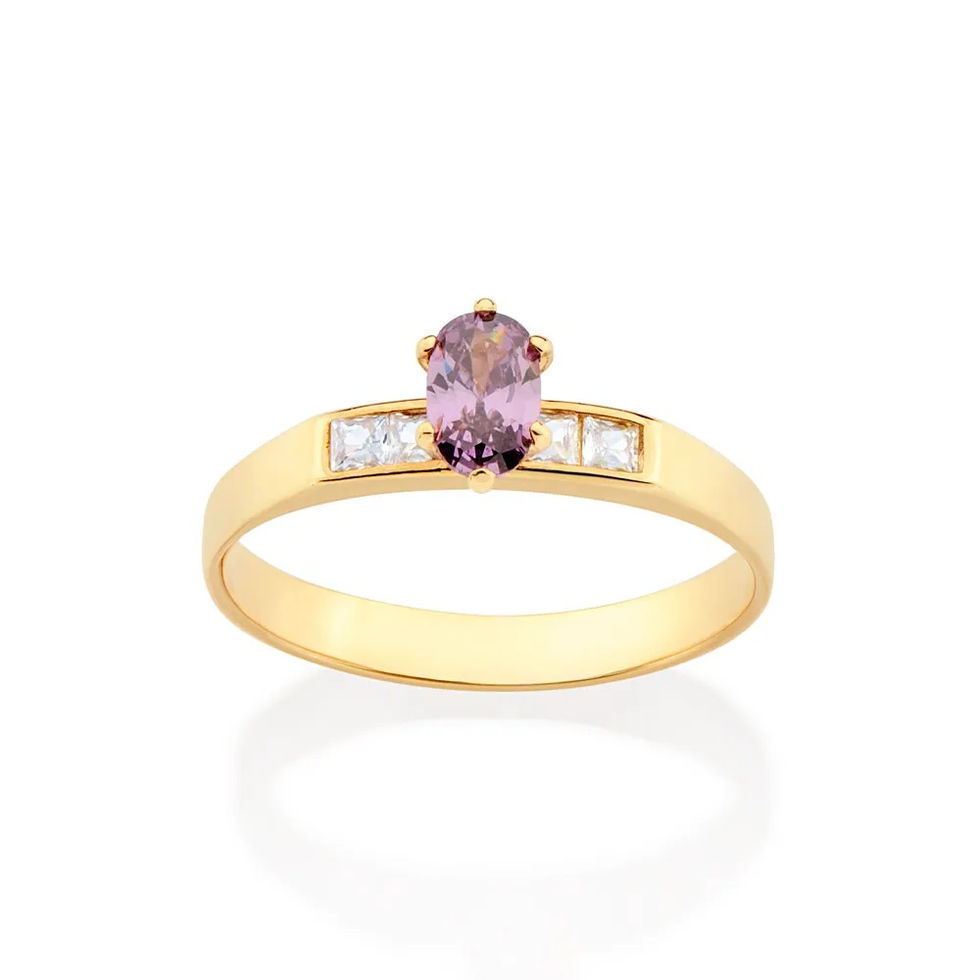 Anel solitário composto por 4 zircônias carrê de 2x2 mm e 1 zircônia oval de 4x6 mm ao centro.