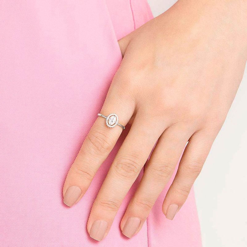 Anel solitário oval cravejado por 24 zircônias de 0,80 mm e 1 zircônia oval de 4x6 mm ao centro.