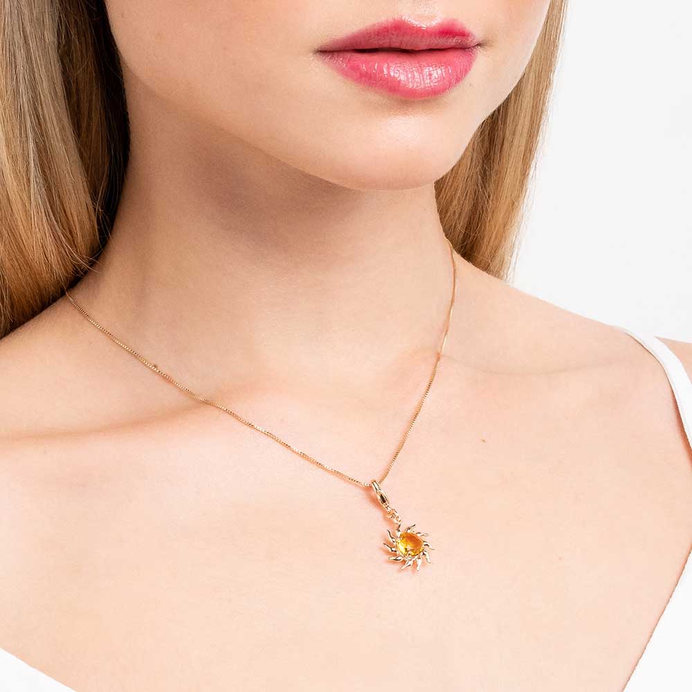 Berloque formato sol cravejado por 1 cristal de 8,0 mm, com fecho lagosta de 1,1 cm.
