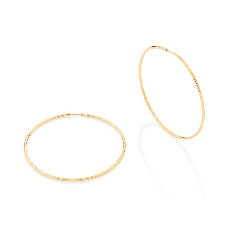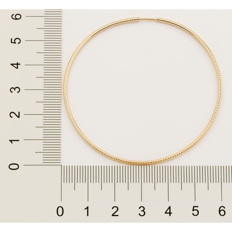 Brinco argola com aro trabalhado por pequenos riscos.
