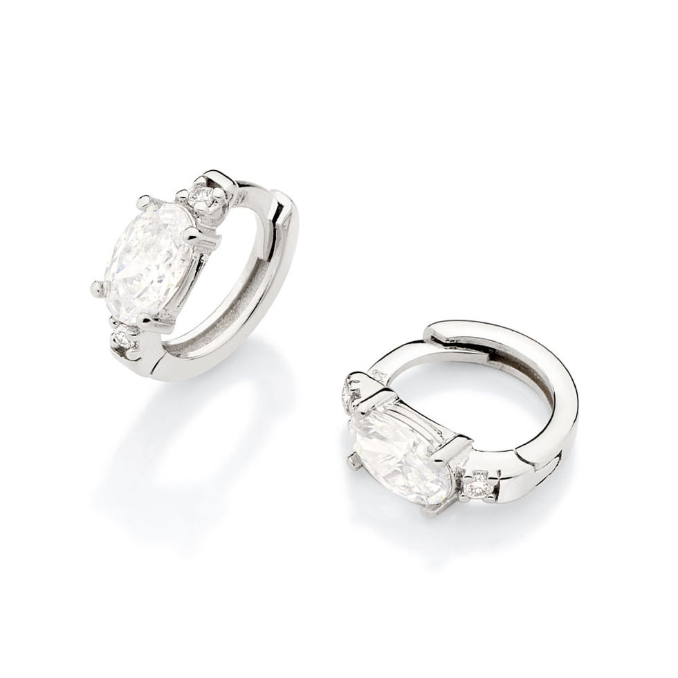 Brinco argola cravejada por 4 zircônias de 1,25 mm e 2 zircônias ovais de 4x6 mm (par).
