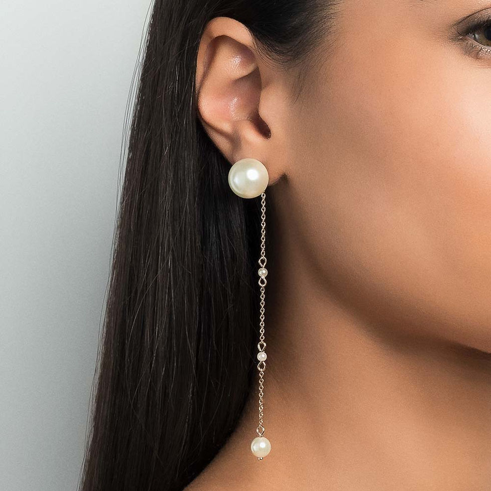 Brinco estilo dois em um composto por base de pérolas sintéticas de 14mm, e por tras corrente de elo cadeado laminado intercalando 4 pérolas de 3mm e 2 pérolas de 7mm .