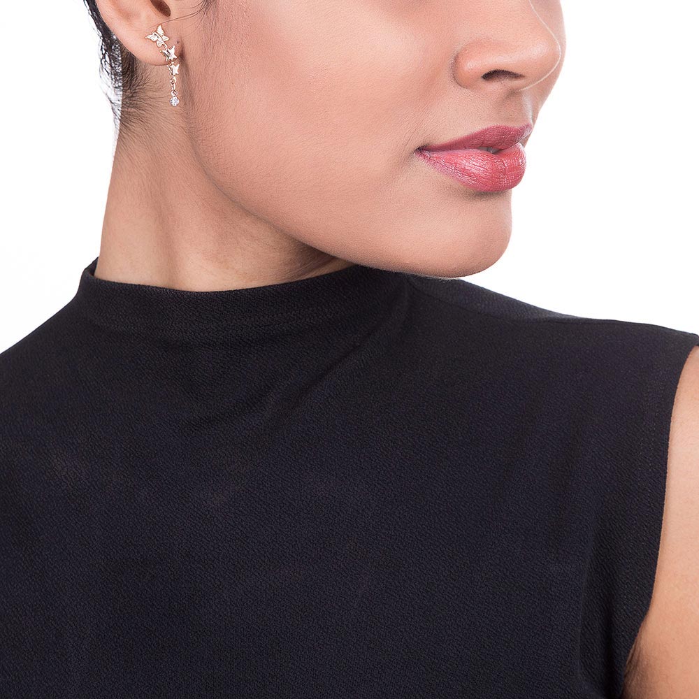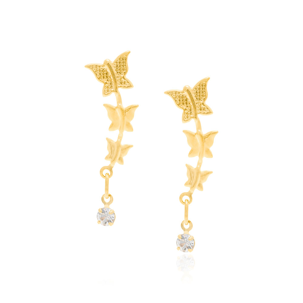 Brinco formado por borboletas de tamanhos diferentes sendo a da base trabalhada e as outras lisas com cristal de 3mm na ponta. med 2,5 cm
