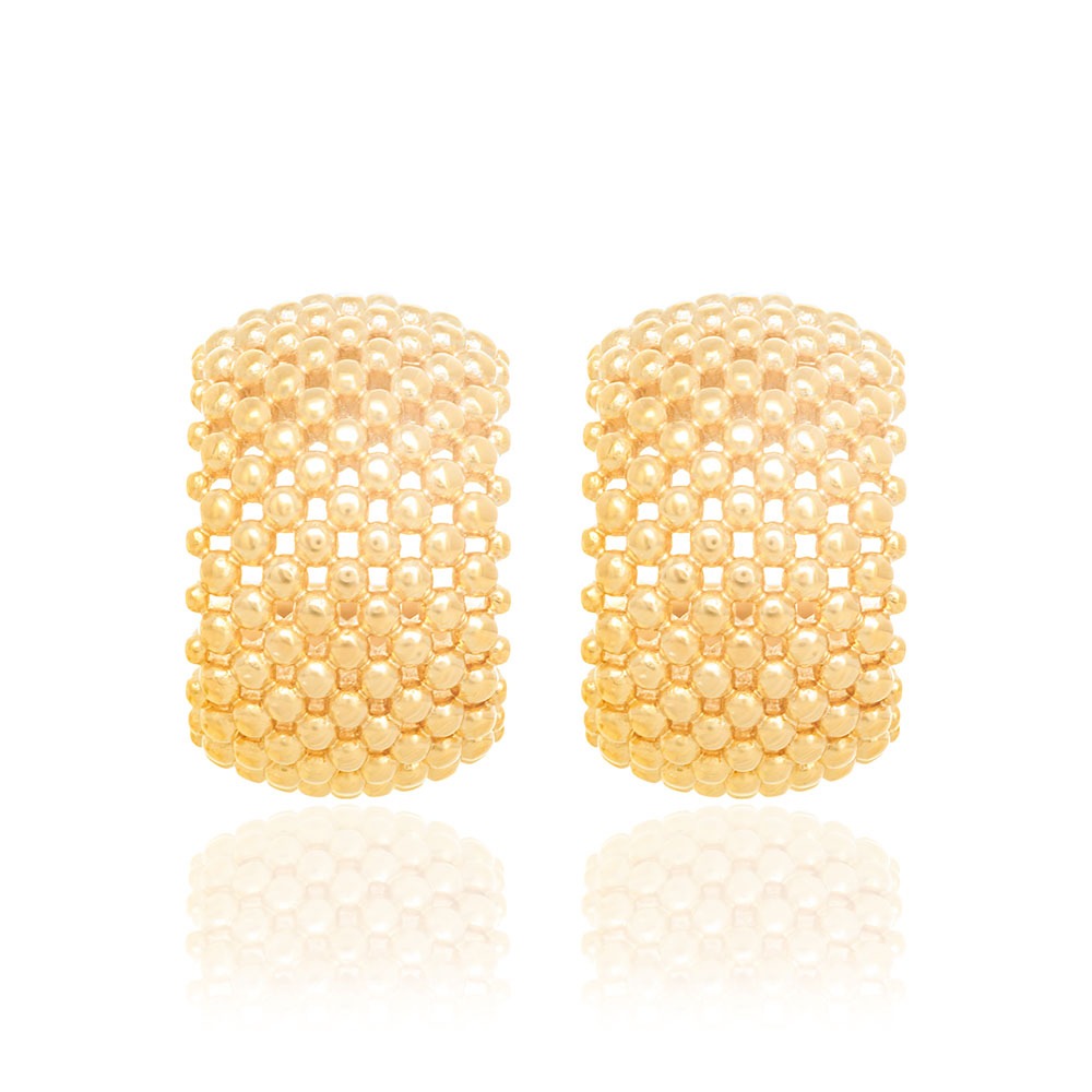 Brinco meia argola aro largo trabalhado com pequenas esferas, tendo detalhes vazados med.1,00 cm