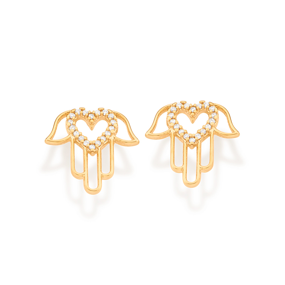 Brinco no formato de mão de fátima, composto por coração ao centro cravejado por 36 zircônias de 0,80 mm (par).