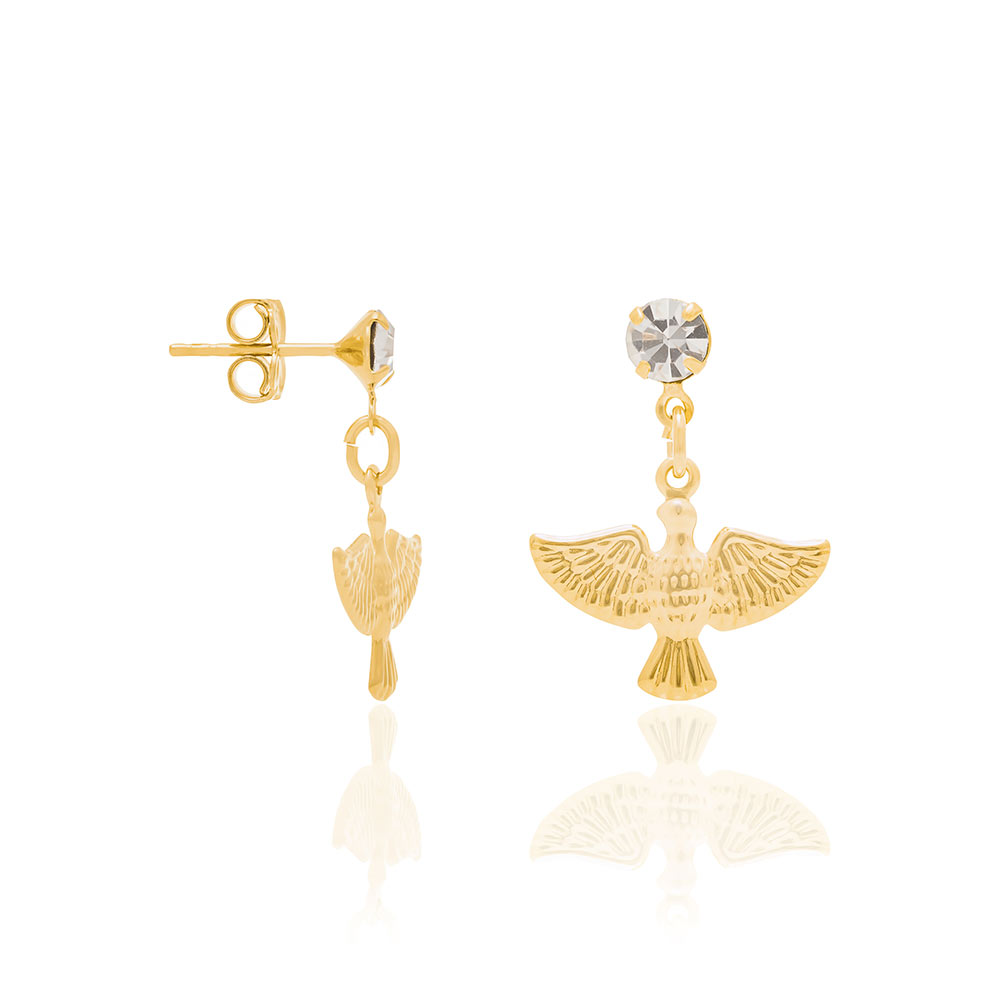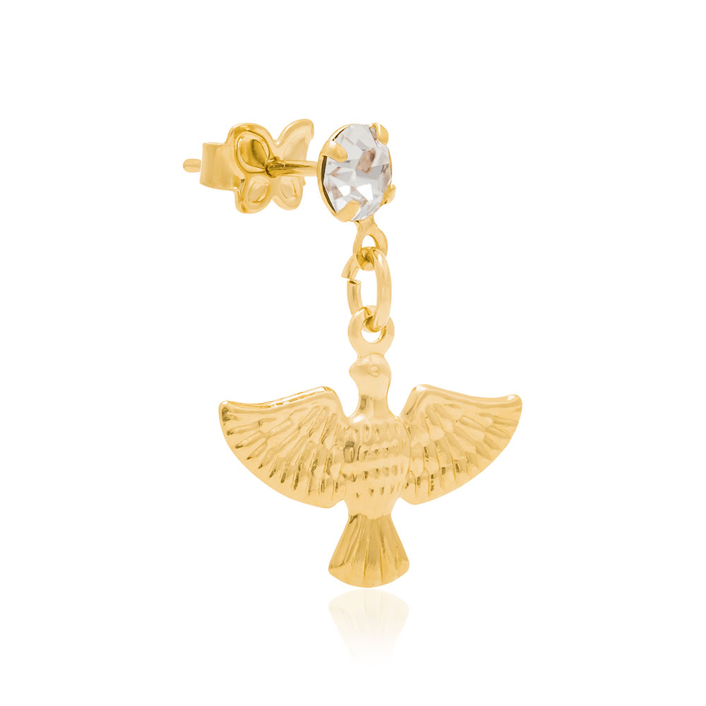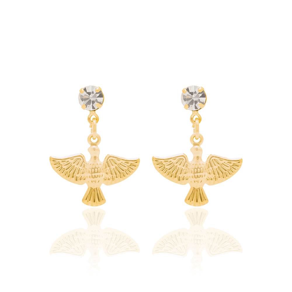 Brinco rommanel banhado ouro cristal espirito santo pendurado 525252 Brinco rommanel Banhado a ouro 18k. brinco formado por base de cristal branco de 5 mm e pingente de espirito santo pendurado.