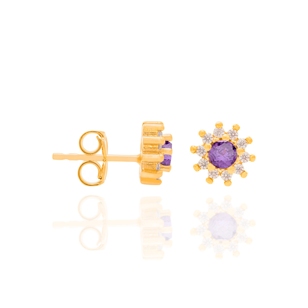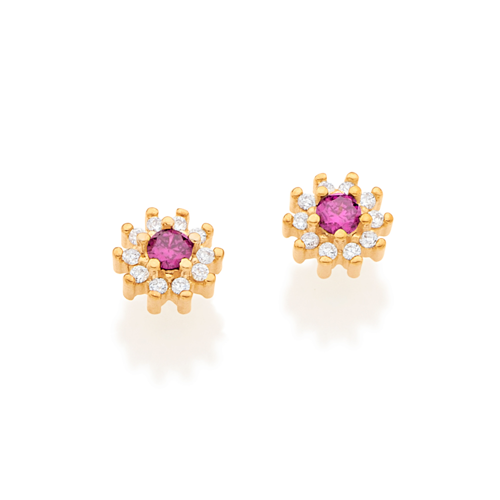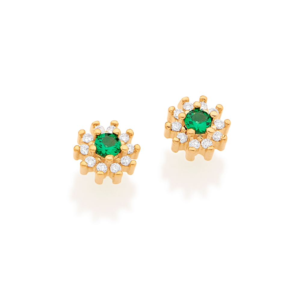 Brinco rommanel banhado ouro 18k flor pequena de zircônia 525721 Brinco de flor rommanel 525721 Banhado a ouro 18k formado por 10 zircônias brancas de 1,25 mm cravejadas em formato de florzinha, contendo outra zircônia branca de 3 mm no centro. Disponível em 5 cores de zircônias.