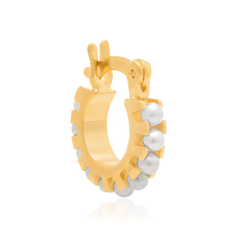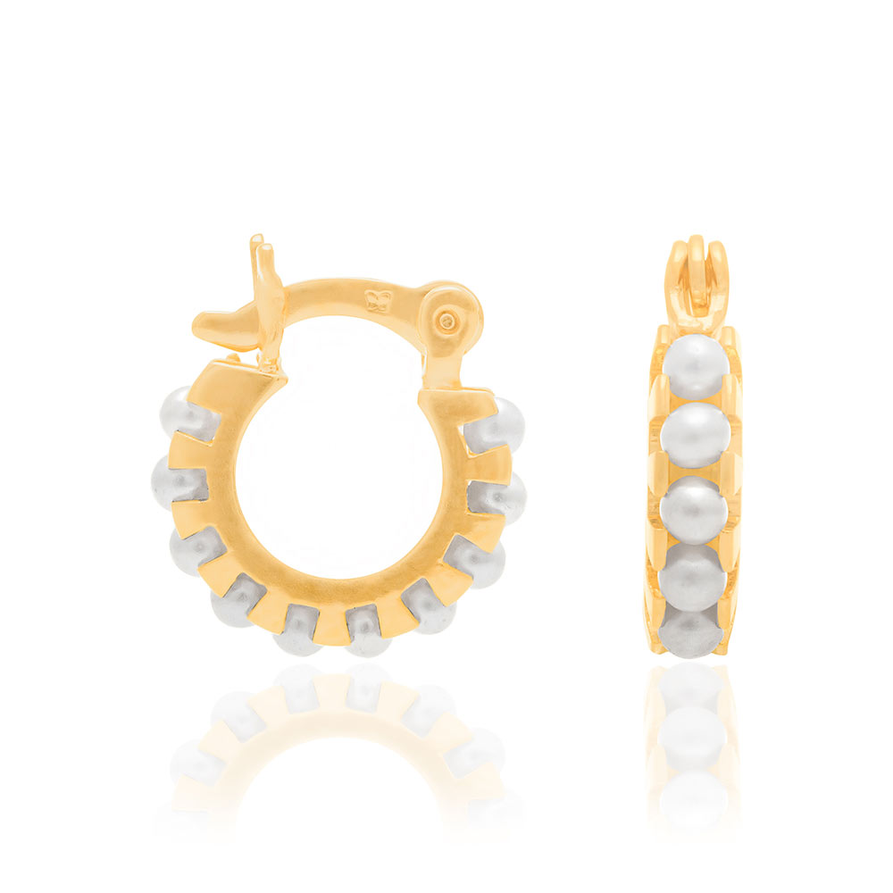 Brinco infantil rommanel Banhado a ouro 18k. brinco infantil formato argola com 10 pérolas de 2,0 mm. este modelo de brinco infantil possui um fecho fácil de colocar e tirar, facilitando a colocação mesmo para crianças pequenas. Além disso, não possui tarraxa pontuda para não machucar a orelha das crianças na hora da colocação.