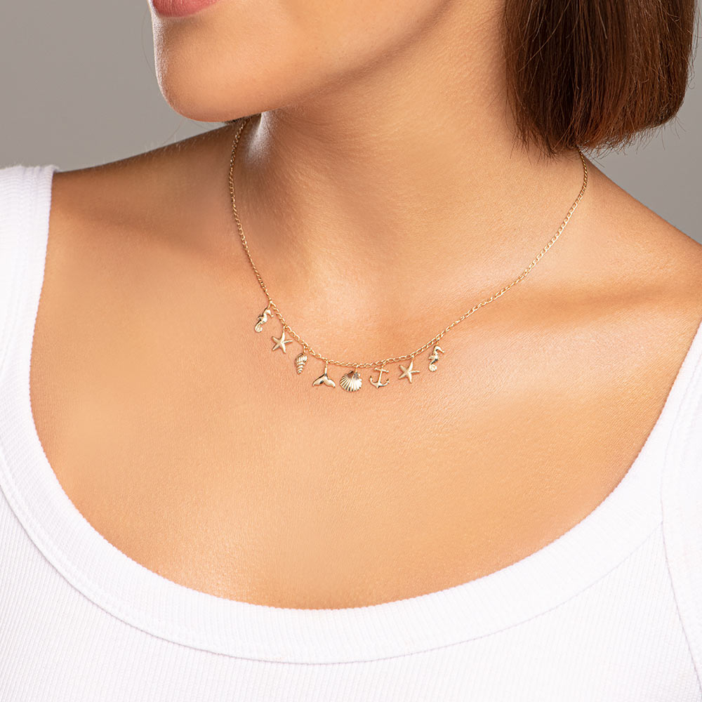 Colar gargantilha banhado a ouro rommanel marítima 532063 Colar rommanel 532063 Banhado a ouro 18k, gargantilha formada por fio de elo 0,40 laminado, contendo 8 pingentes,2 cavalos marinhos, 2 estrelas do mar, 1 âncora, 1 concha aberta, 1 concha fechada e 1 rabo de sereia.