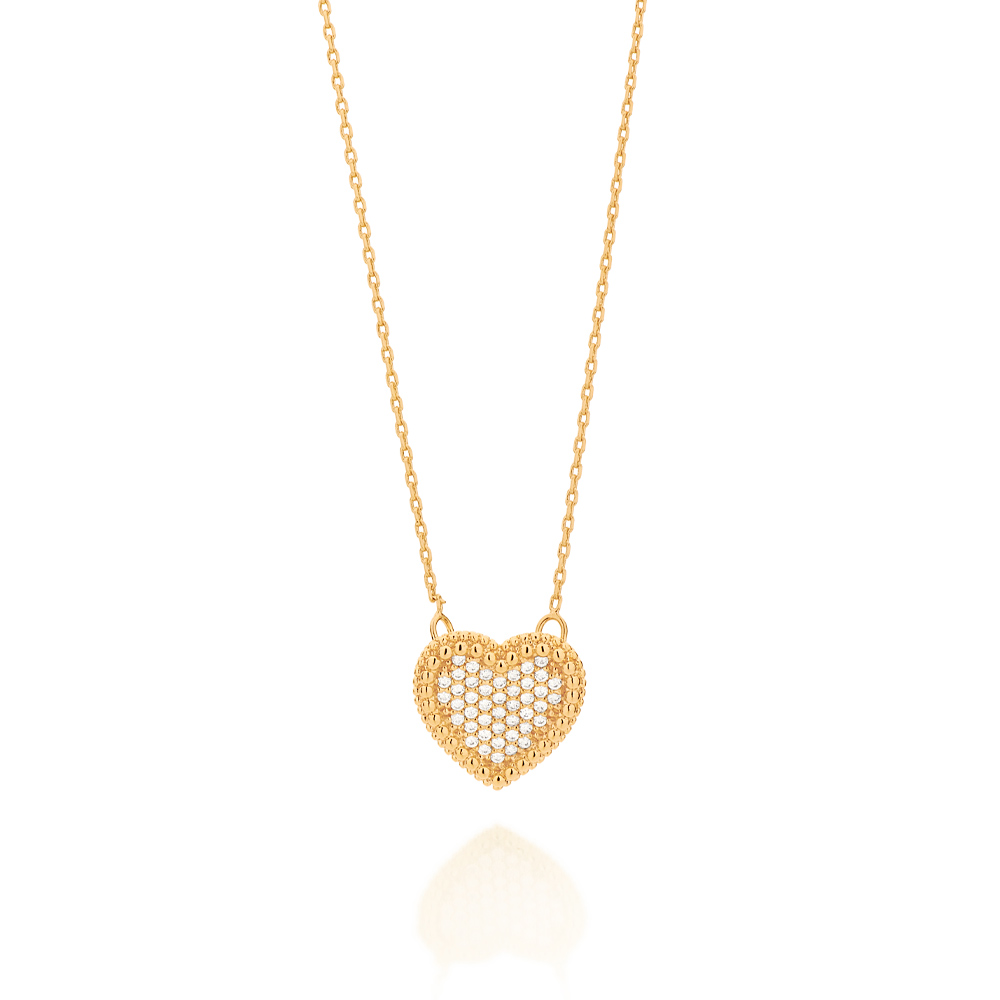 Colar rommanel banhado ouro coração brilhante e delicado 531484 Colar rommanel Banhado a ouro 18k. colar formado por fio de elos 0,35 com pingente de coração delicado cravejado por 44 zircônias brancas brilhantes de 1,25 mm cada uma, tendo a parte da borda trabalhada com bolinhas.