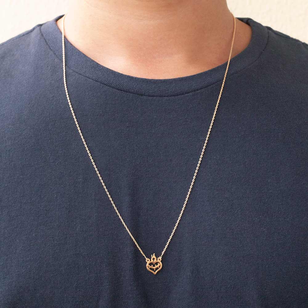 Escapulário formado por fio elos cadeado diamantados, composto por símbolo sagrado coração de jesus de um lado, e símbolo do espírito santo do outro lado, com detalhes vazados.