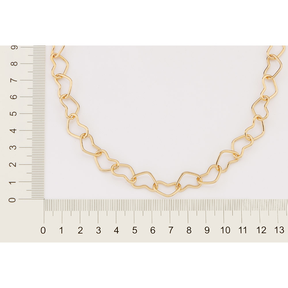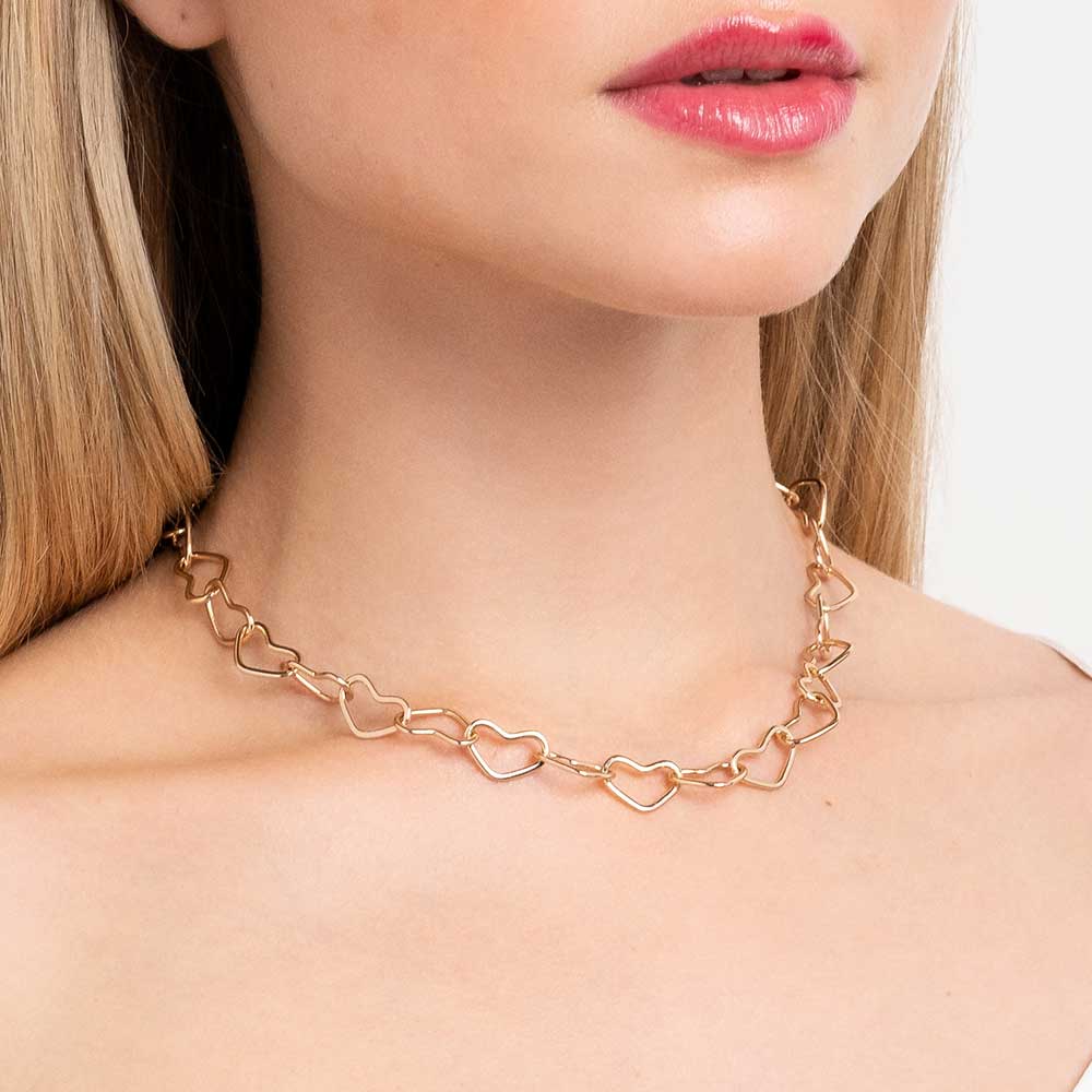 Gargantilha composta por corrente no formato de corações, com fecho lagosta de 1,5 cm.