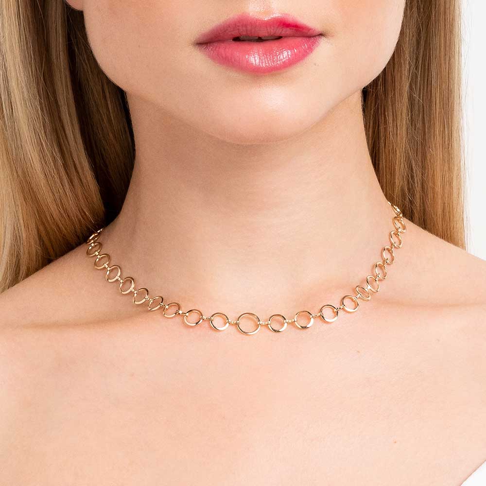 Gargantilha formada por corrente de elos redondos batidos, com fecho lagosta de 1,1 cm.