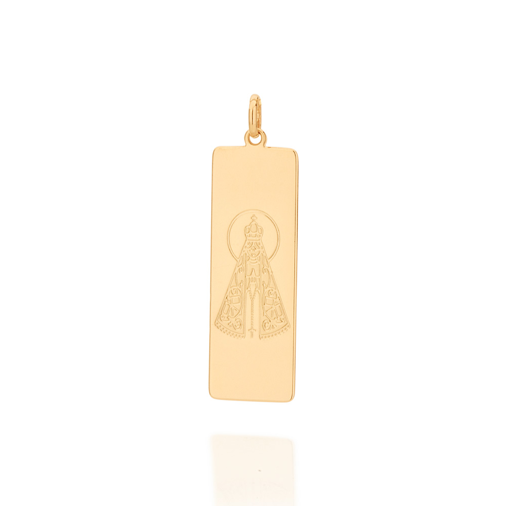 Pingente medalha retangular, com um lado formado por imagem da nossa senhora aparecida e do outro com a oração ave maria.