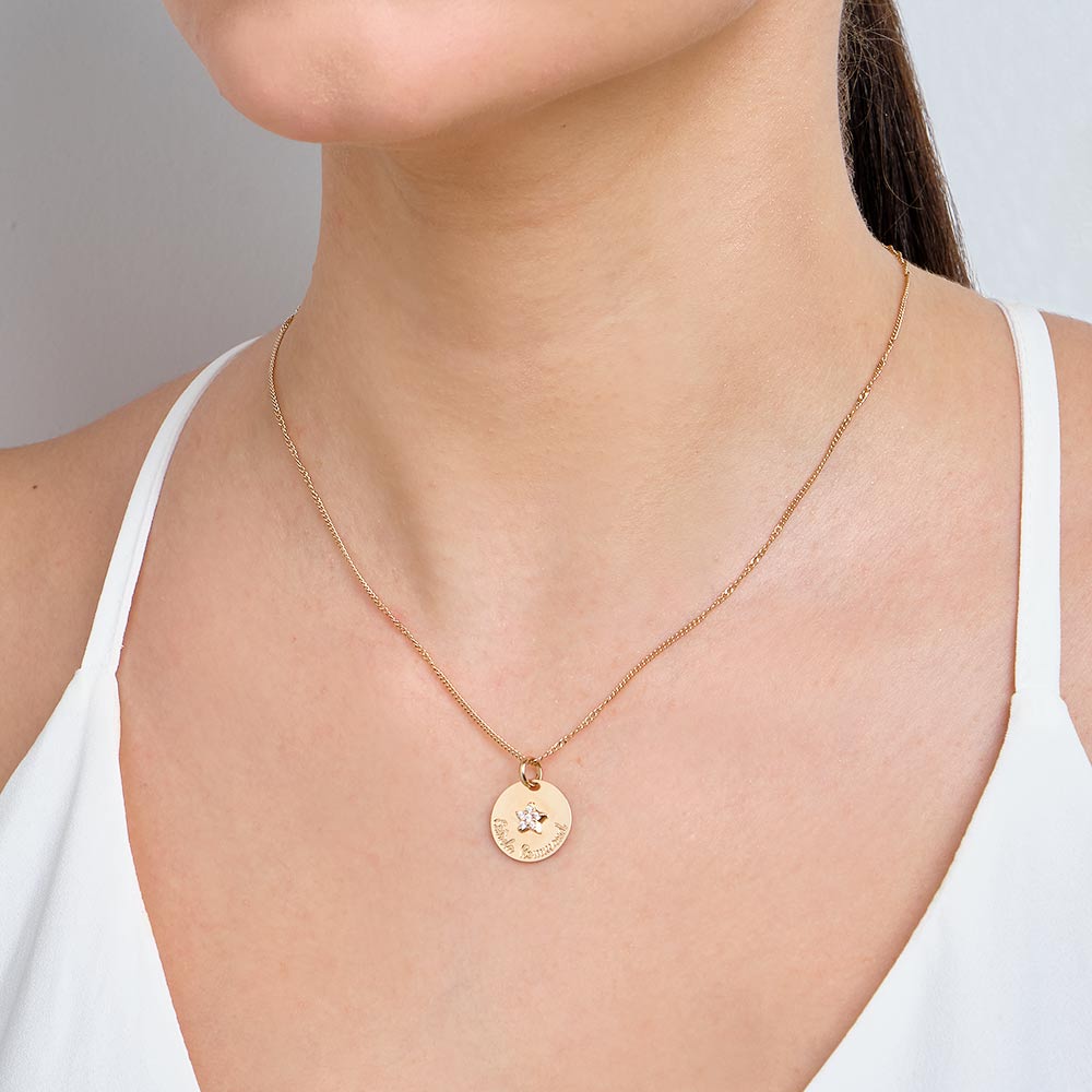 Pingente medalha composto por estrela cravejada por 5 zircônias de 1,25 mm e 1 zircônia de 1,50 mm, com escrita estrela rommanel.