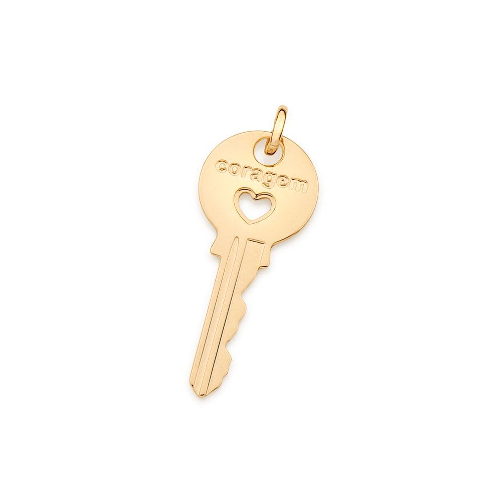 Pingente no formato de chave, escrito coragem e um coração vazado ao centro.