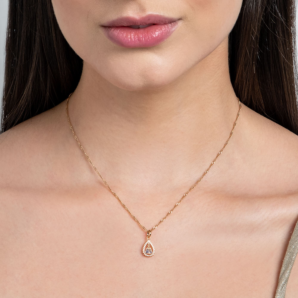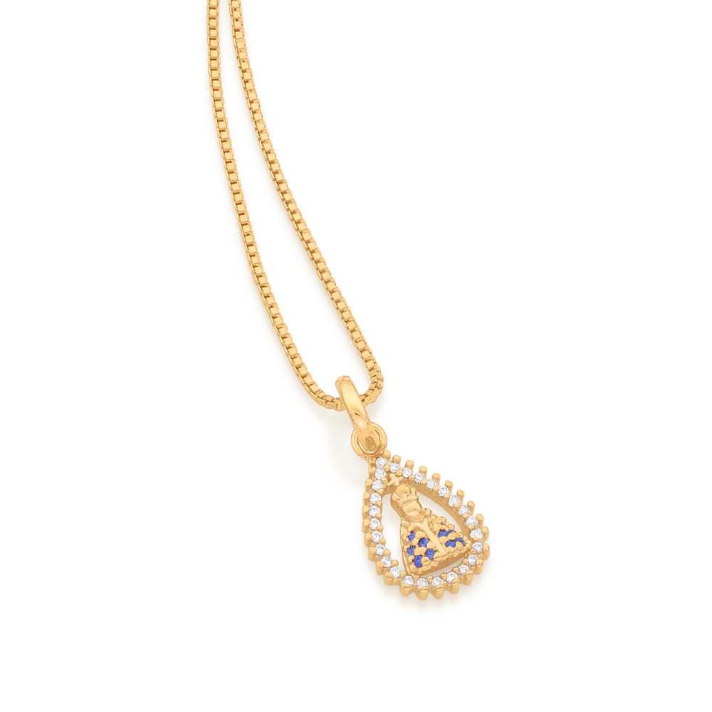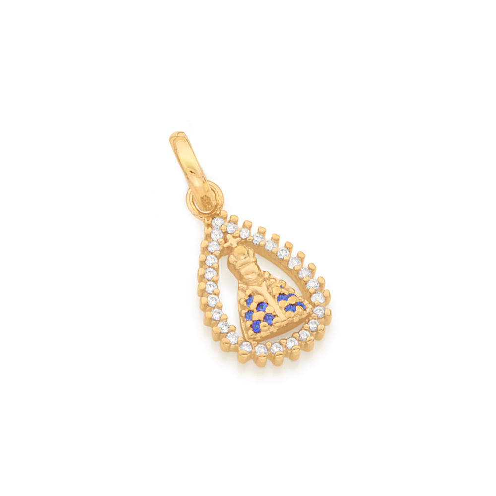 Pingente formato gota cravejado por 26 zircônias de 0,80 mm, com imagem nossa senhora aparecida ao centro composta por 10 zircônias de 0,80 mm.