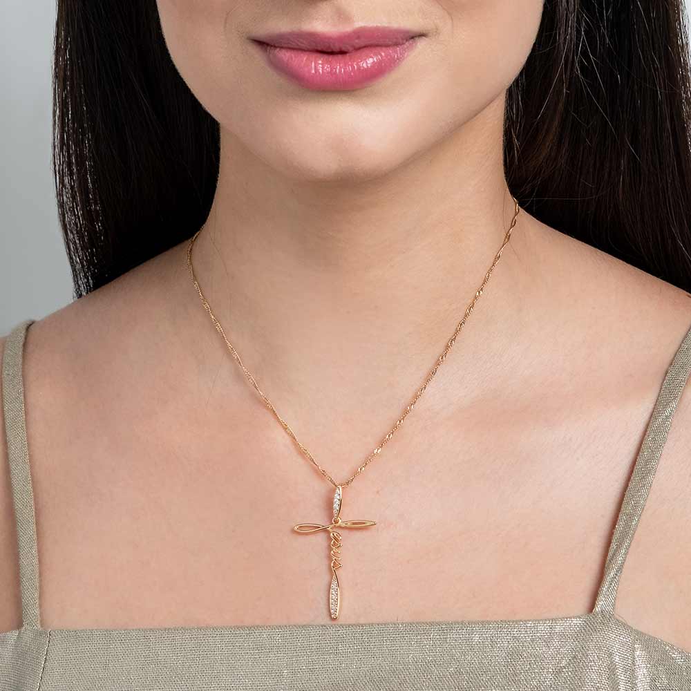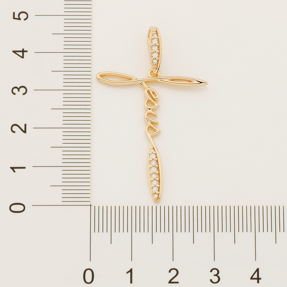 Pingente escrito jesus, cravejado por 4 zircônias de 1,0 mm e 9 zircônias de 1,50 mm.