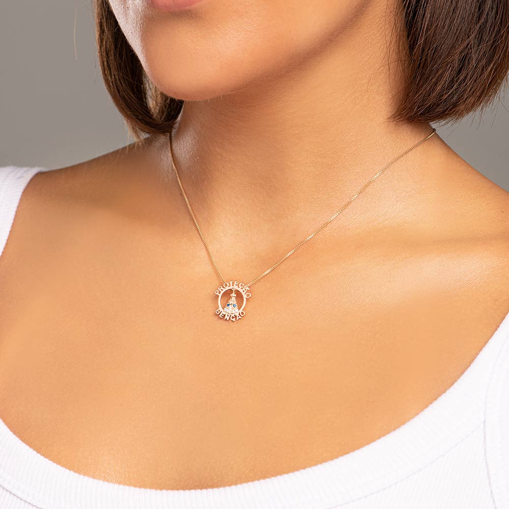 Pingente redondo com nossa senhora aparecida ao centro, cravejado por 6 zircônias de 1,0 mm, escrito proteção em cima e benção em baixo.