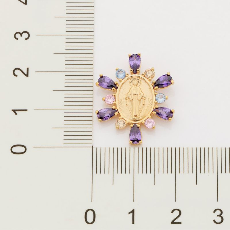 Pingente oval composto por 6 zircônias de 2,5 mm e 6 zircônias gotas de 3x5 mm, com imagem de nossa senhora das graças ao centro.