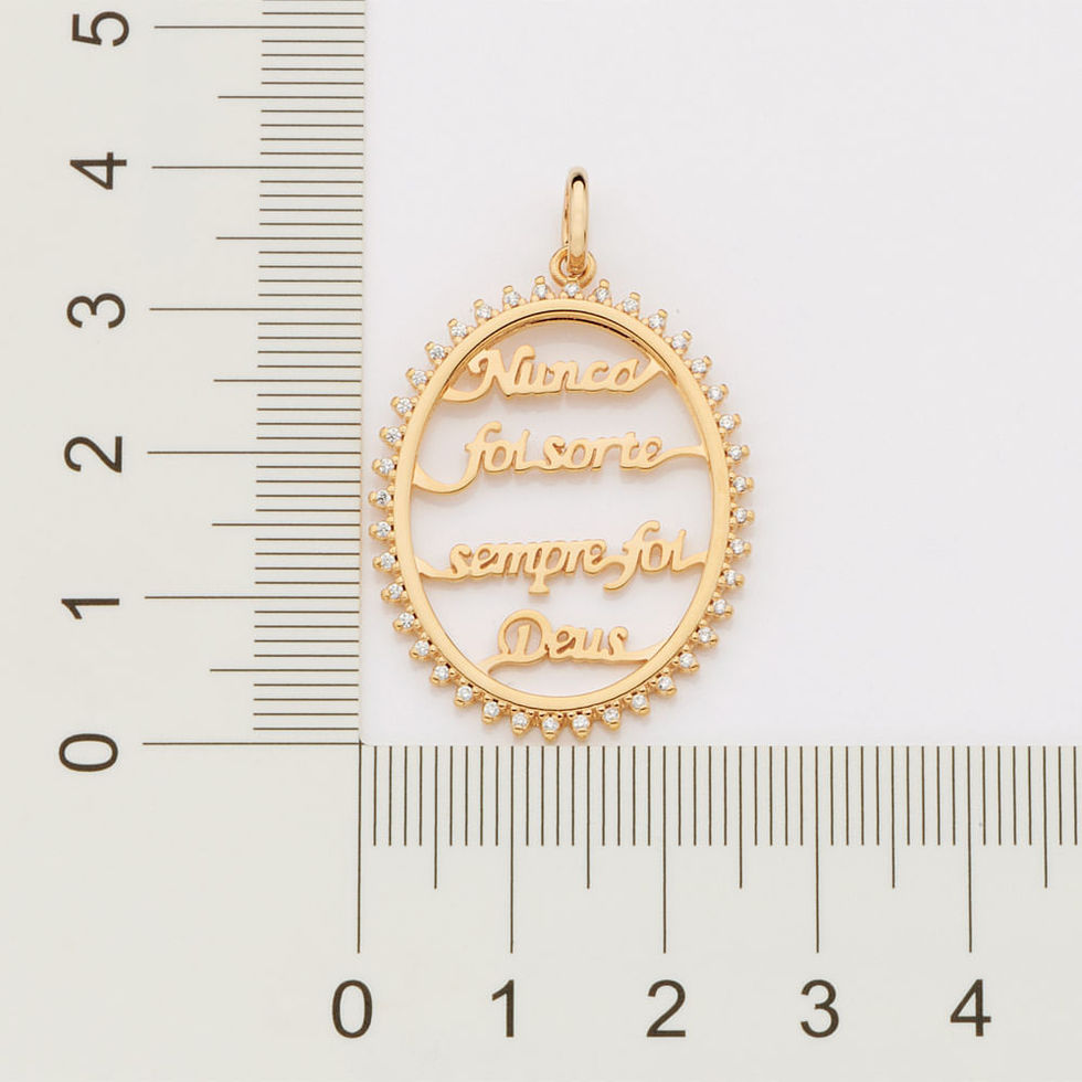 Pingente oval cravejado por 40 zircônias de 1,0 mm ao redor, com frase nunca foi sorte sempre foi deus ao centro.
