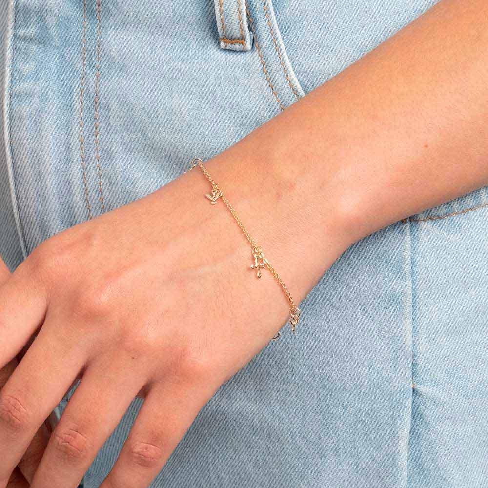 Pulseira rommanel com espíritos santos e cruzes folheada a ouro
