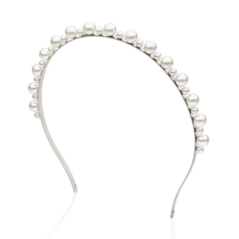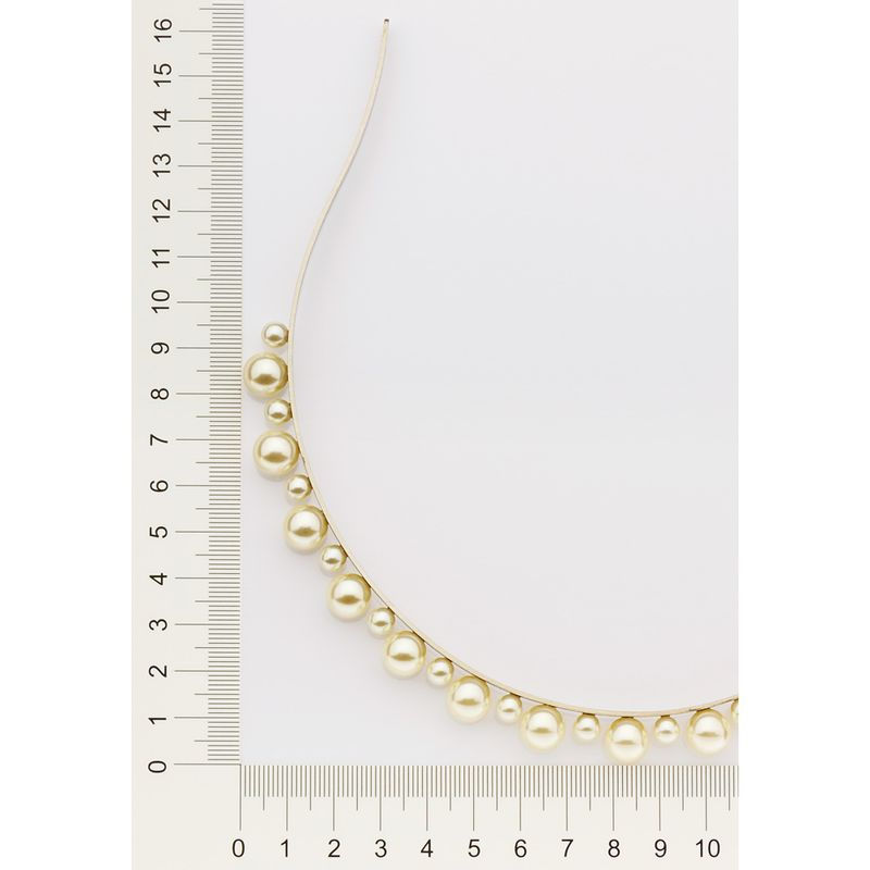 Tiara composta por 16 pérolas sintéticas de 6mm intercaladas por 15 pérolas sintéticas de 10mm.